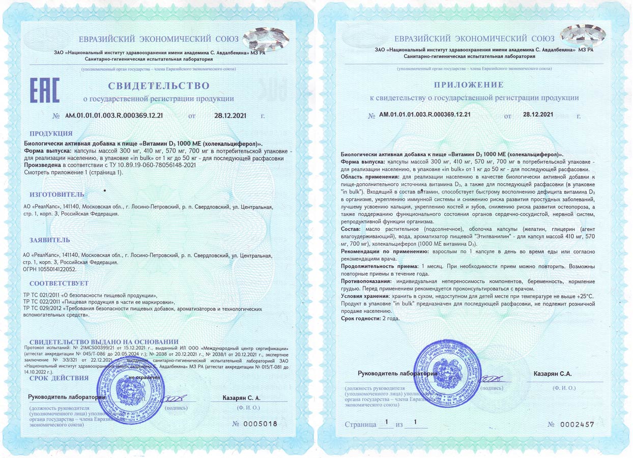 Свидетельство о государственной регистрации № AM.01.01.01.003.R.000369.12.21 от 28.12.2021 ТУ 10.89.19-060-78056148-2021